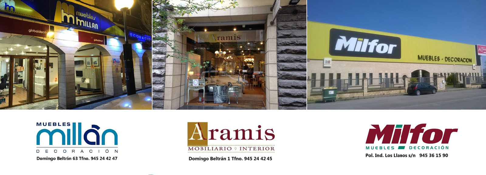 El Grupo Muebles Millán, a través de sus 2 tiendas en Vitoria-Gasteiz ( Muebles Millán Decoración y Aramis Mobiliario Interior) y su tienda en el Polígono Industrial Los Llanos a sólo 20 minutos del centro de Vitoria-Gasteiz( Milfor Muebles y Decoración ), pone a tu alcance la oferta más completa que puedas desear.
